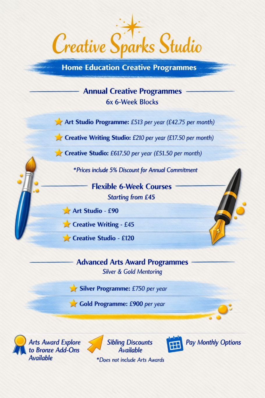 If your budding artist or writer has a passion for creativity, consider our Creative Studio package, which offers a small discount on both art and writing sessions. Plus, families with more than one creative in the mix can take advantage of our sibling discounts on these sessions! I do want to mention that, unfortunately, we can't offer discounts on the arts award programmes since I cover the admin and moderation costs imposed by Trinity College London. You’ll find the costs listed annually, but don’t worry! They can also be paid monthly or in those convenient six-week blocks.
