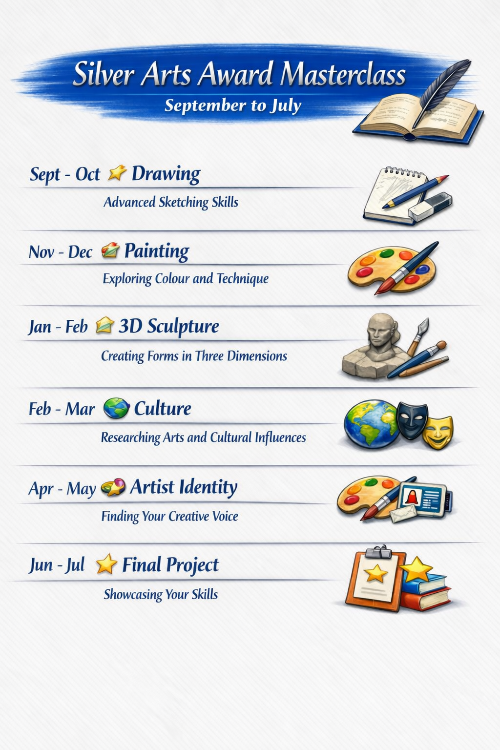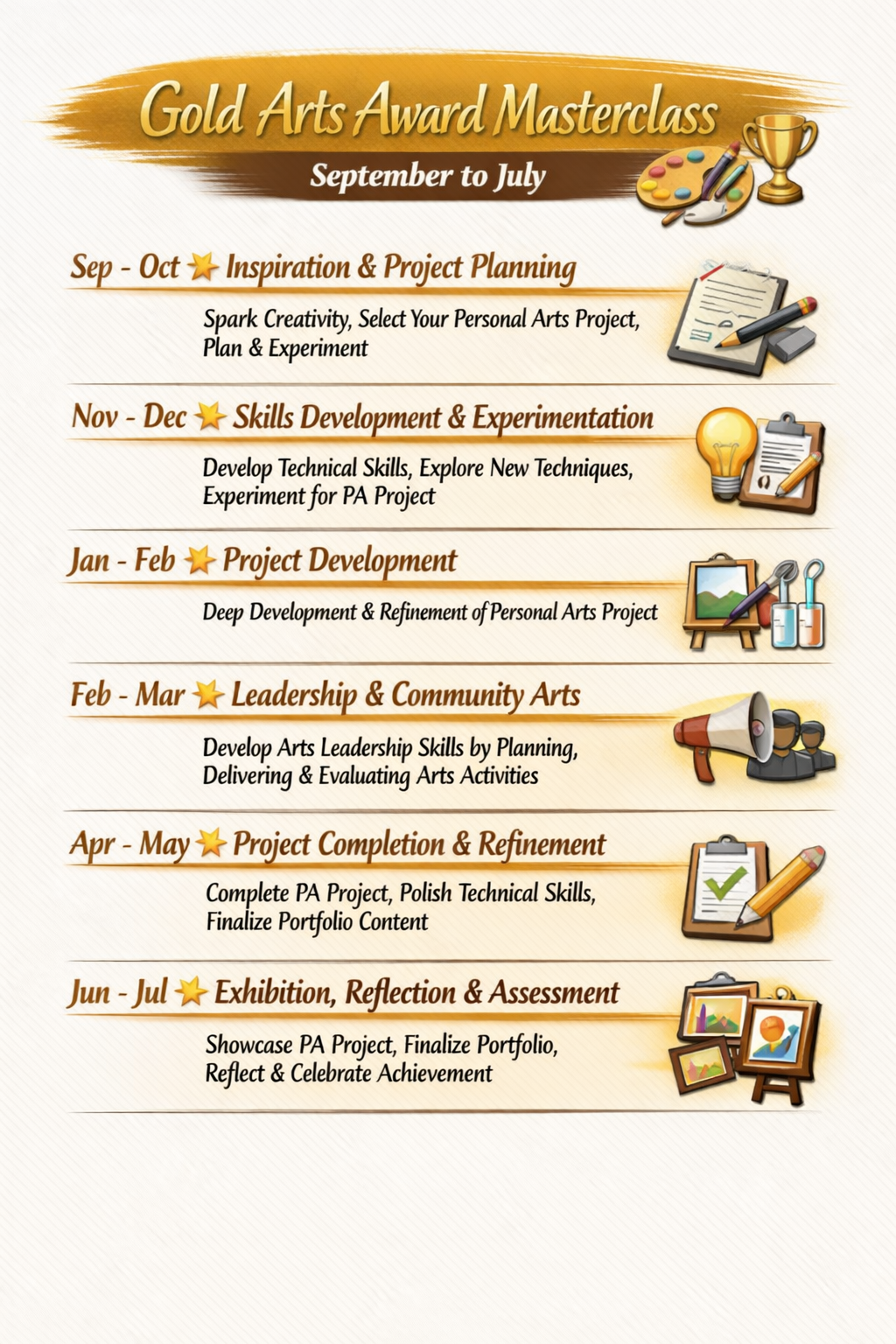 My Gold Arts Award Masterclass is delivered as a year-long programme, thoughtfully structured into six 6-week blocks. This format provides both consistency and flexibility, allowing students to build momentum over time while engaging in focused, manageable stages of the qualification.