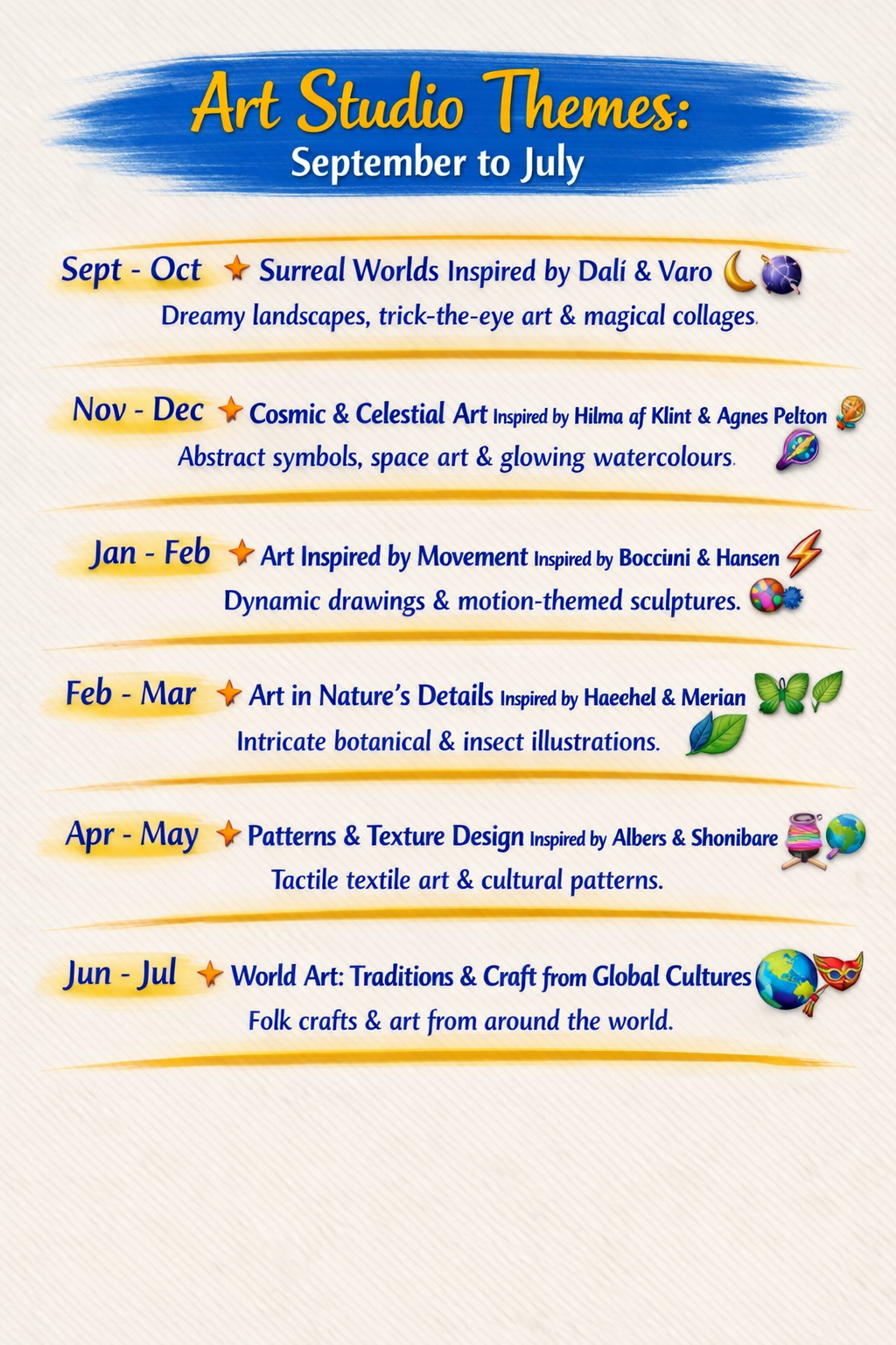 This home education art programme runs in themed 6-week blocks, designed to balance structured skill-building with creative exploration. Each block is centred around a carefully chosen theme and introduces students to the work of two different artists, giving them a broad and inspiring view of artistic styles and approaches.
