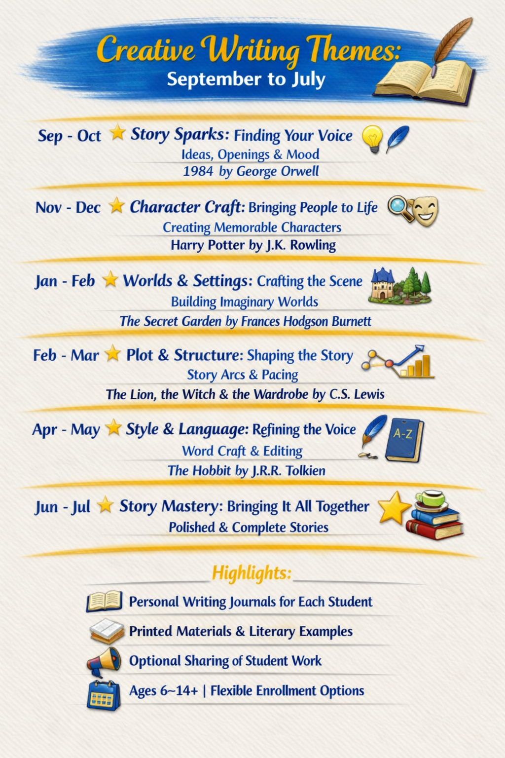 The creative writing programme is delivered in themed 6-week blocks, each designed to spark imagination while building core writing skills. Every block can be taken as a standalone experience, or combined to form a complete, progressive course across the year.